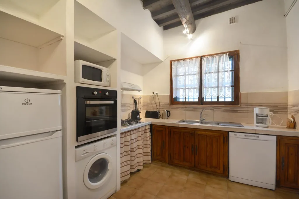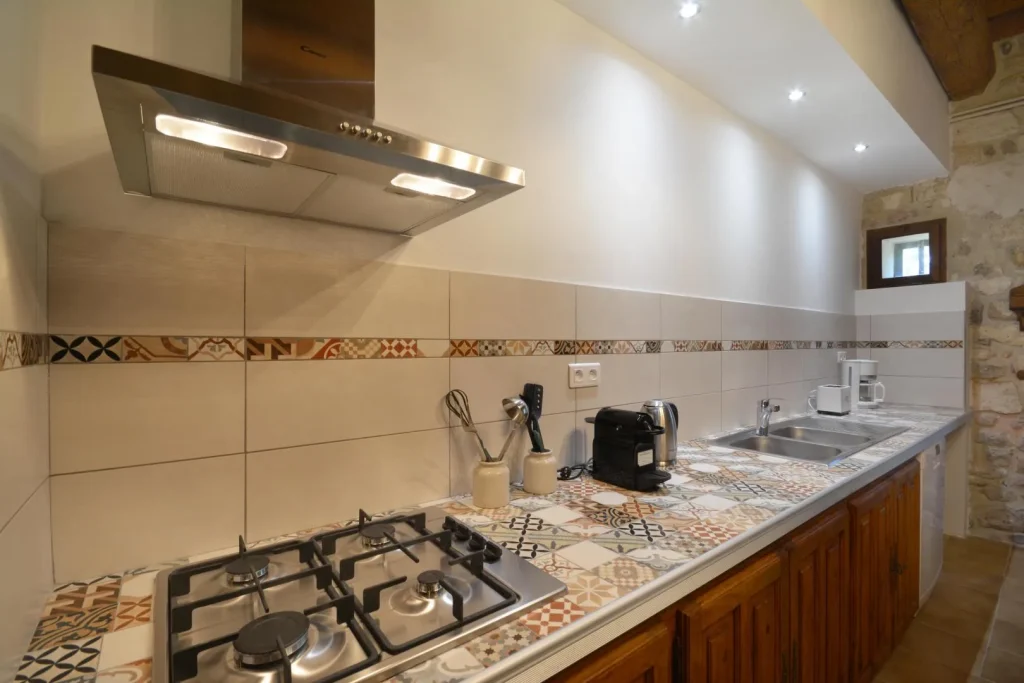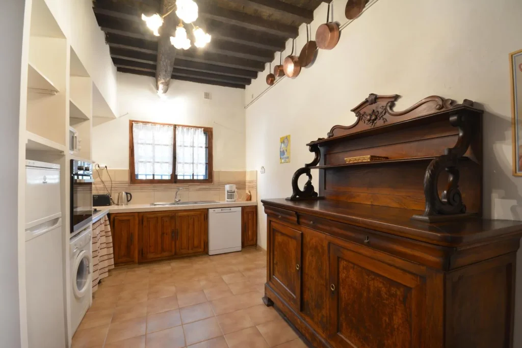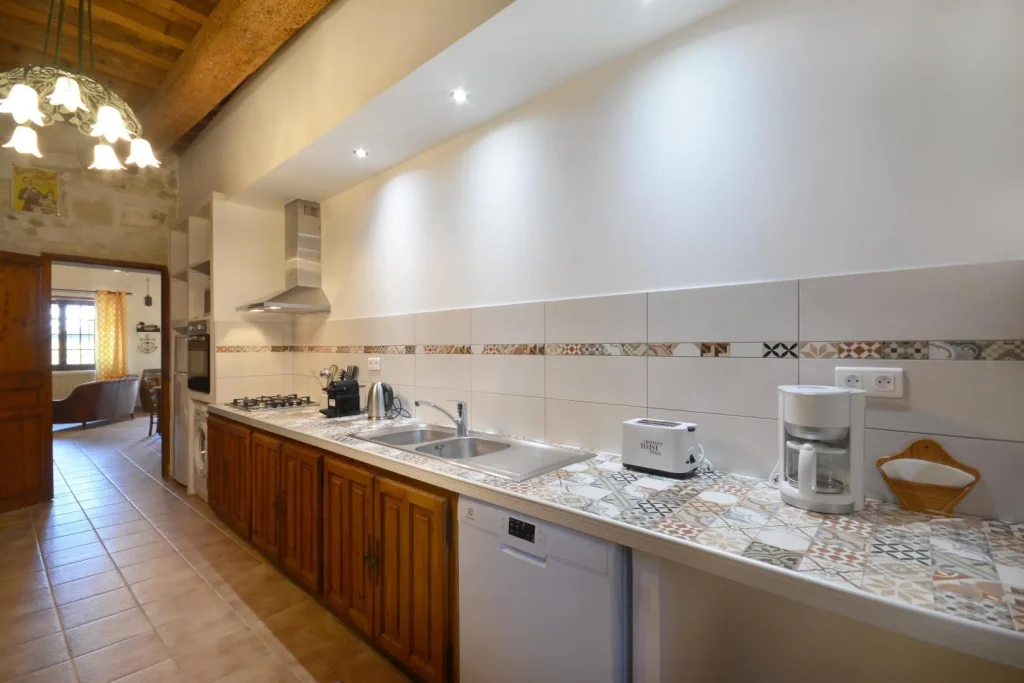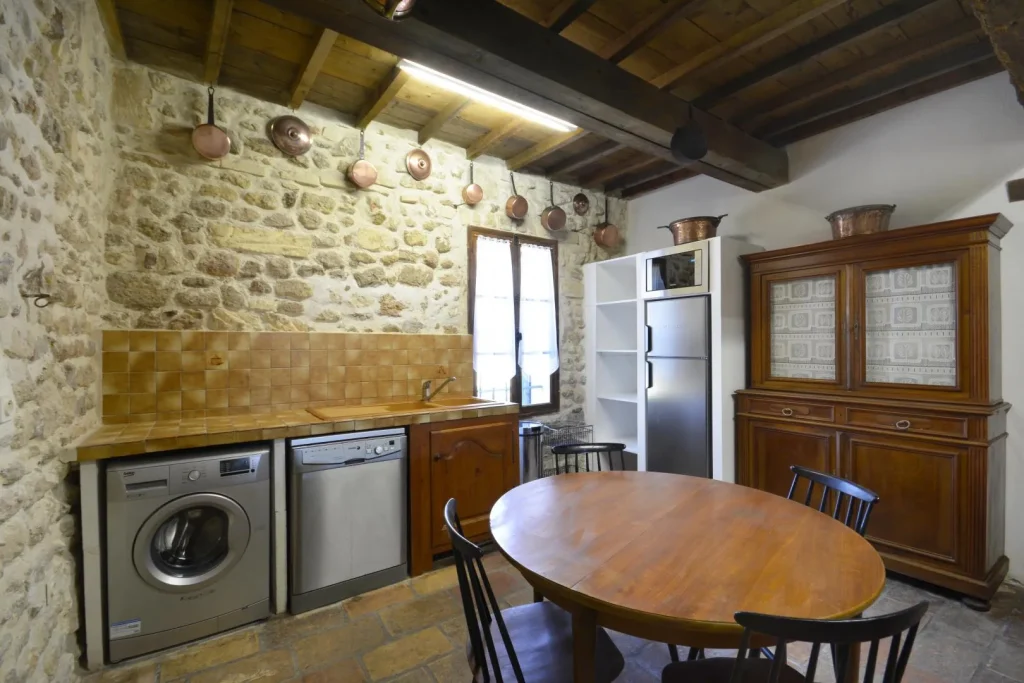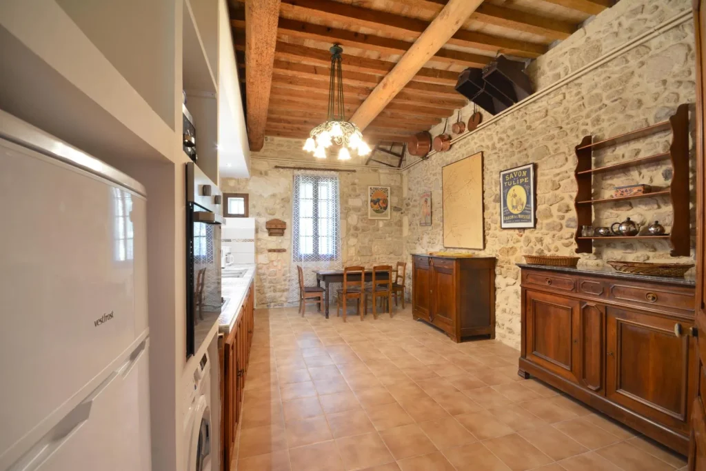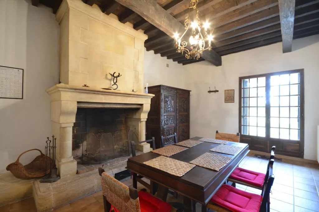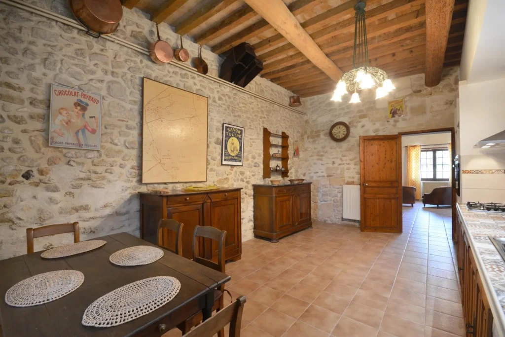 Séjour avec grande cheminée camarguaise, cuisine équipée / Salle à manger