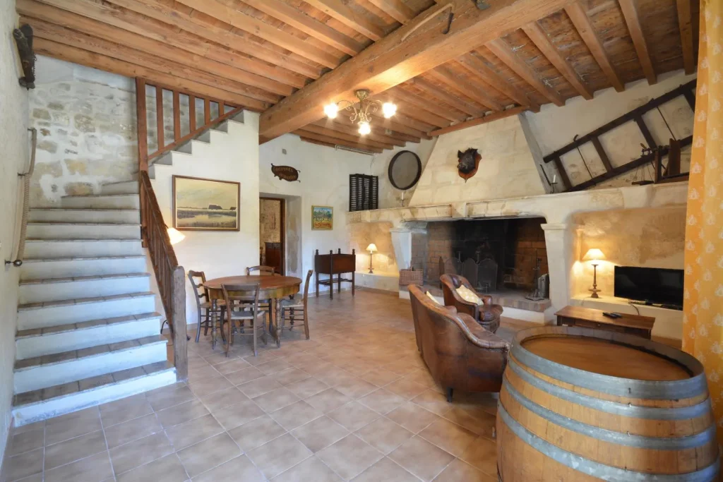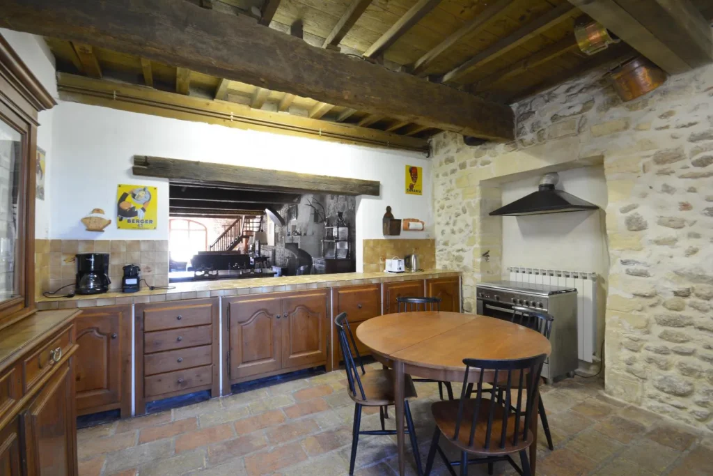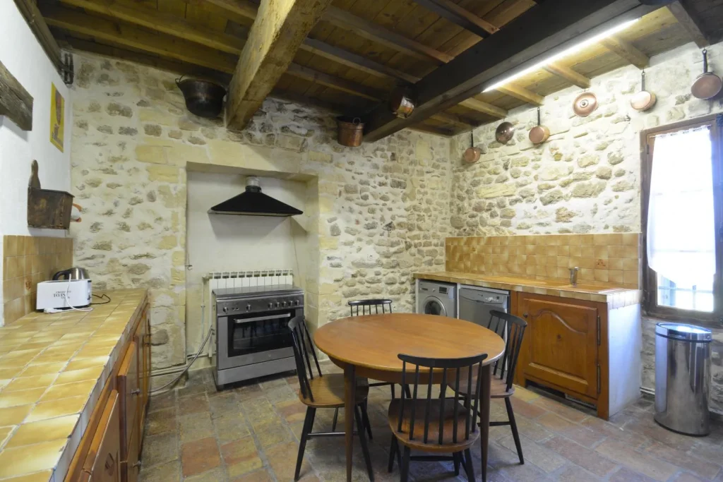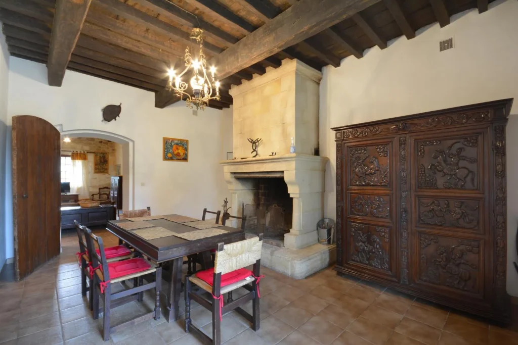 Vaste séjour/salle à manger de 140 m² avec cheminée. Grande table de repas. Cuisine équipée ouverte sur le séjour.