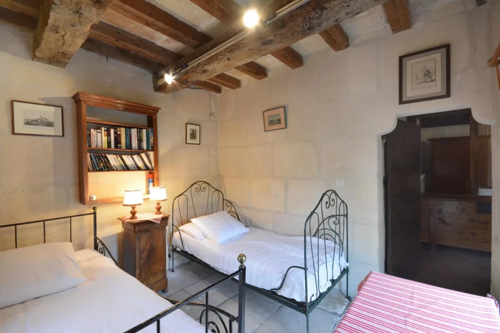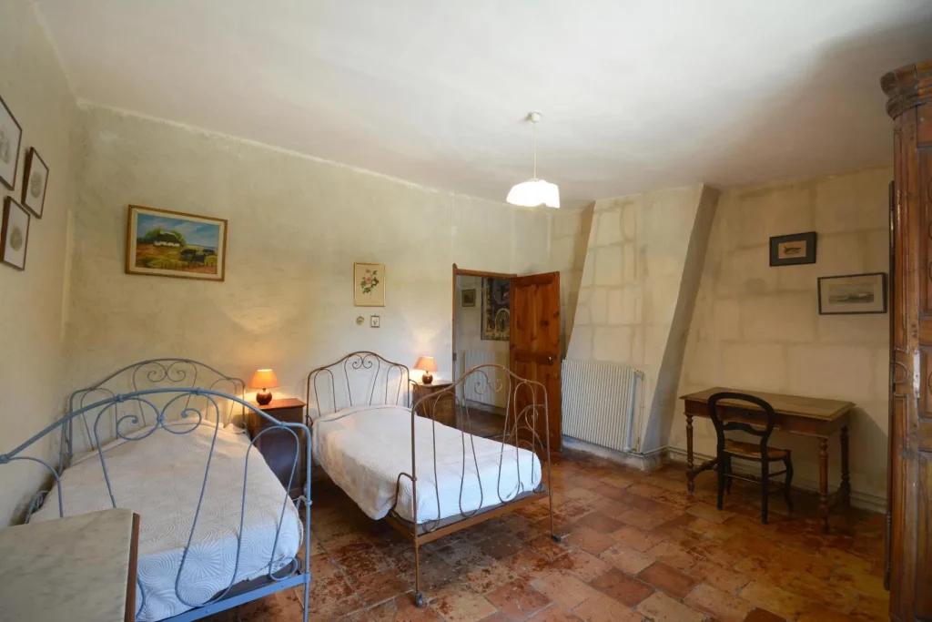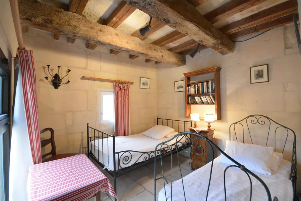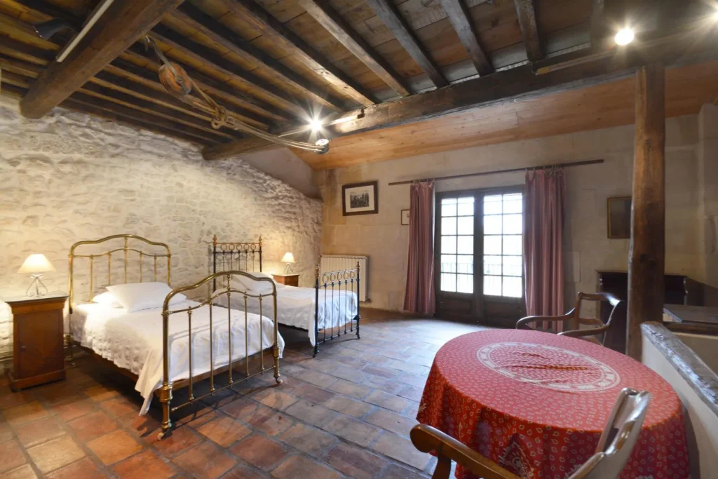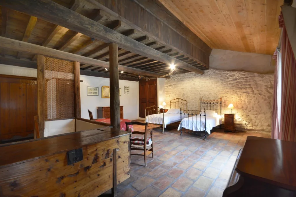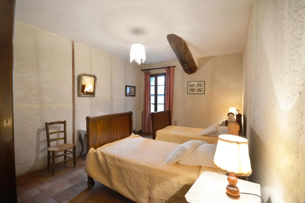 Une vaste chambre avec beaucoup de cachet, comprenant un lit en 140 et un lit 1 personne (90x190cm), traversante. Une chambre avec deux lits 1 personne en 100x190cm, accessible par la première chambre.