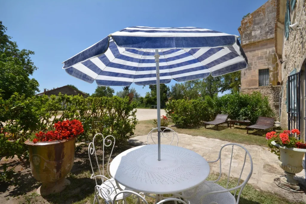 Terrasse de 72 m² non close, cour commune de l’exploitation, équipée d’un salon de jardin, d’un barbecue et d’un parking.